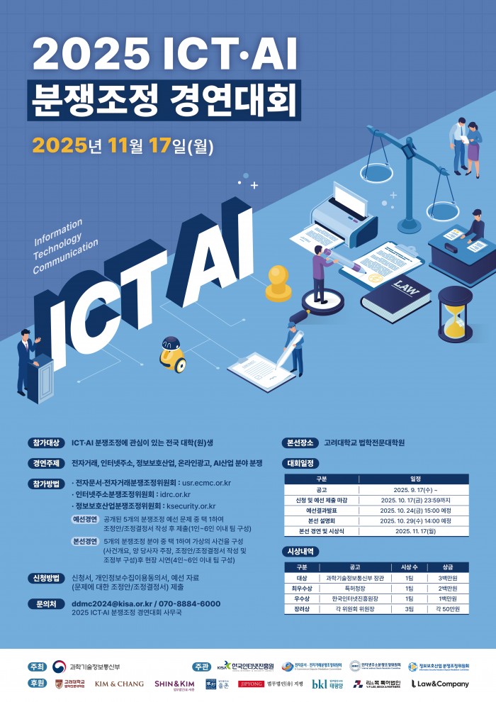 2025 ICT ․ AI 분쟁조정 경연대회 안내 페이지 정보 작성자관리자 조회 223회 작성일 2025-09-26 10:28:49 댓글 0 본문 첨부파일을 참고하시기 바랍니다. 이전글 제5회 군사법 변론경연대회 홍보 다음글2025년도 제3차 변호사시험 모의시험 관련 IBT 프로그램 테스트 협조 요청 목록 댓글목록 등록된 댓글이 없습니다.