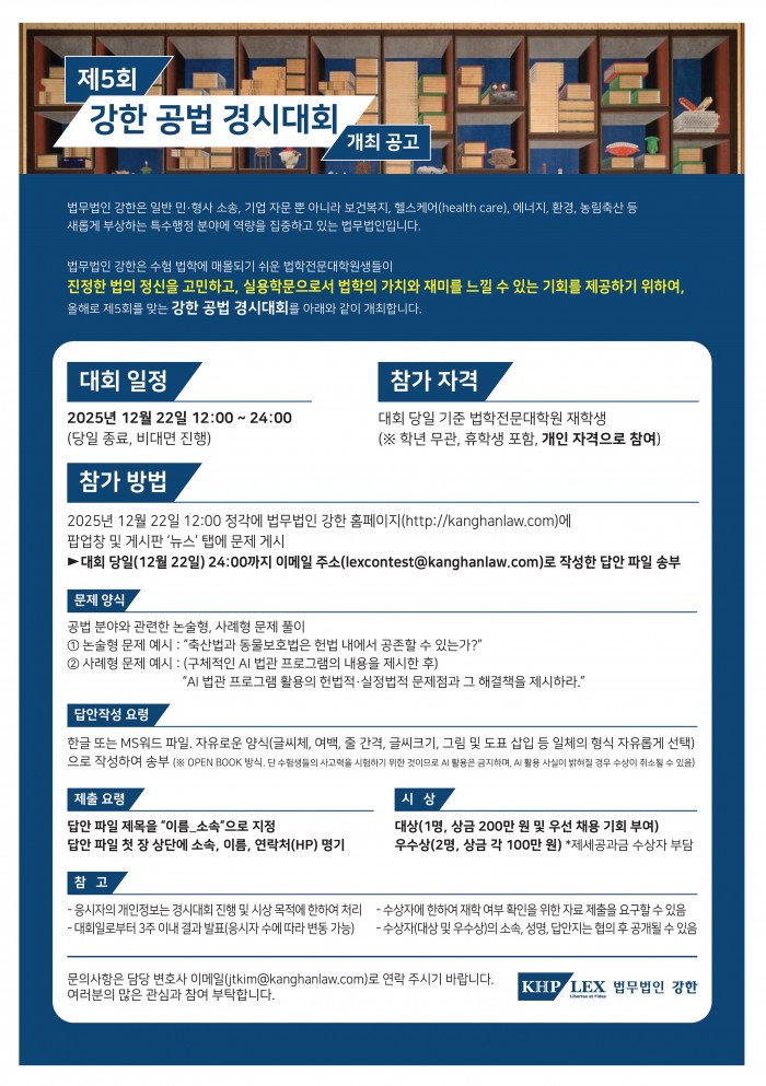 [법무법인 강한] 제5회 강한 공법 경시대회 안내 페이지 정보 작성자관리자 조회 75회 작성일 2025-11-24 15:29:28 댓글 0 본문 첨부파일 2025년 제5회 강한 공법 경시대회 공고.hwp (940.0K) 5회 다운로드 | DATE : 2025-11-24 15:29:28 이전글 2025-2 검찰실무1 시험 안내 다음글2026년 제15회 변호사시험 충북대 생활관 이용 안내 목록 댓글목록 등록된 댓글이 없습니다.
