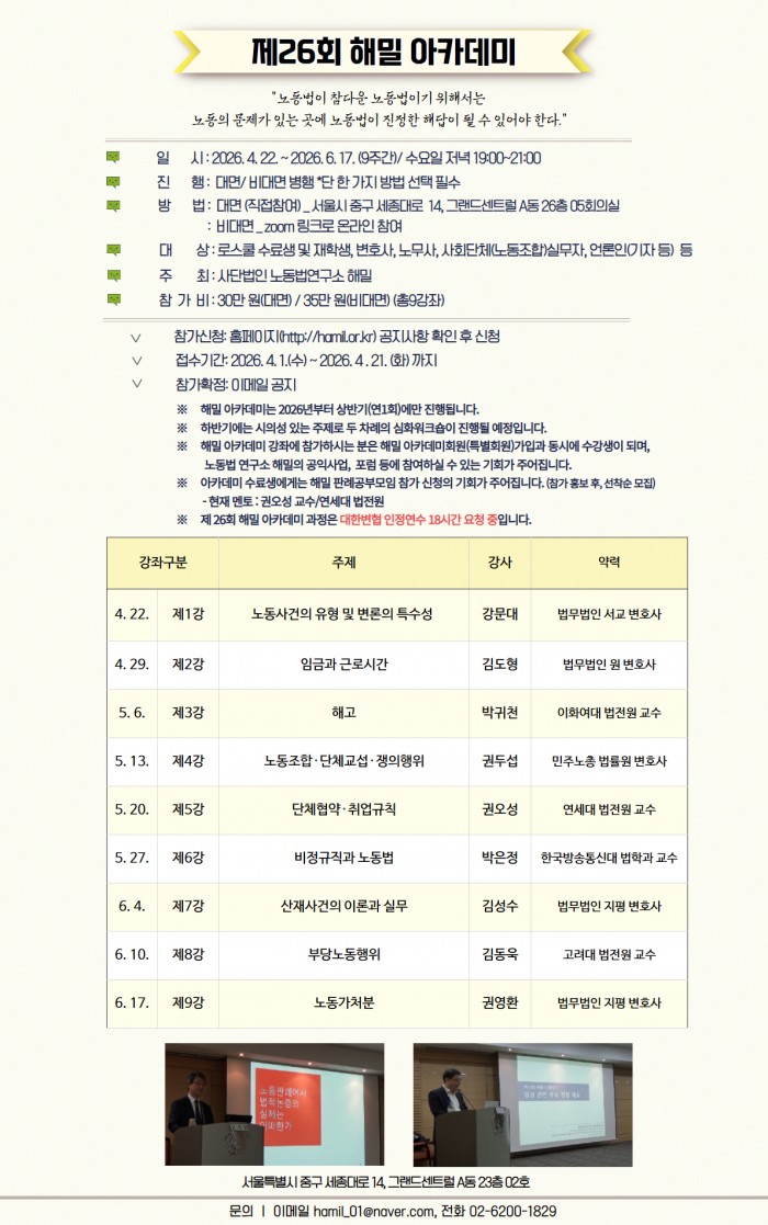 [해밀] 제23회 해밀 아카데미 협조 페이지 정보 작성자관리자 조회 322회 작성일 2026-04-10 댓글 0 본문 이번 아카데미는 4월 22일에 개강하여 6월 17일까지 9주 동안 진행됩니다. 이전글 2026년 검찰설명회 개최 안내 다음글[필독] 2026년도 국가거점국립대학교 법학전문대학원장협의회 공동모의고사 시행 안내 목록 댓글목록 등록된 댓글이 없습니다.