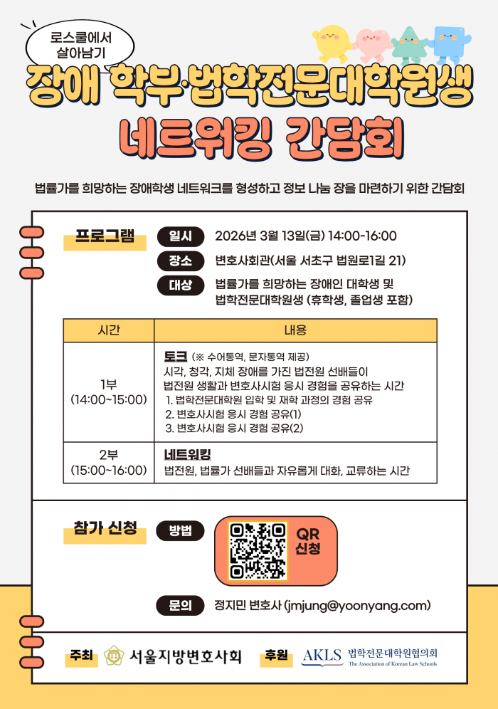 - 붙임1 장애 학부_법학전문대학원생 네트워킹 간담회 포스터.pdf (1.3M) 3회 다운로드 | DATE : 2026-02-23 15:19:41