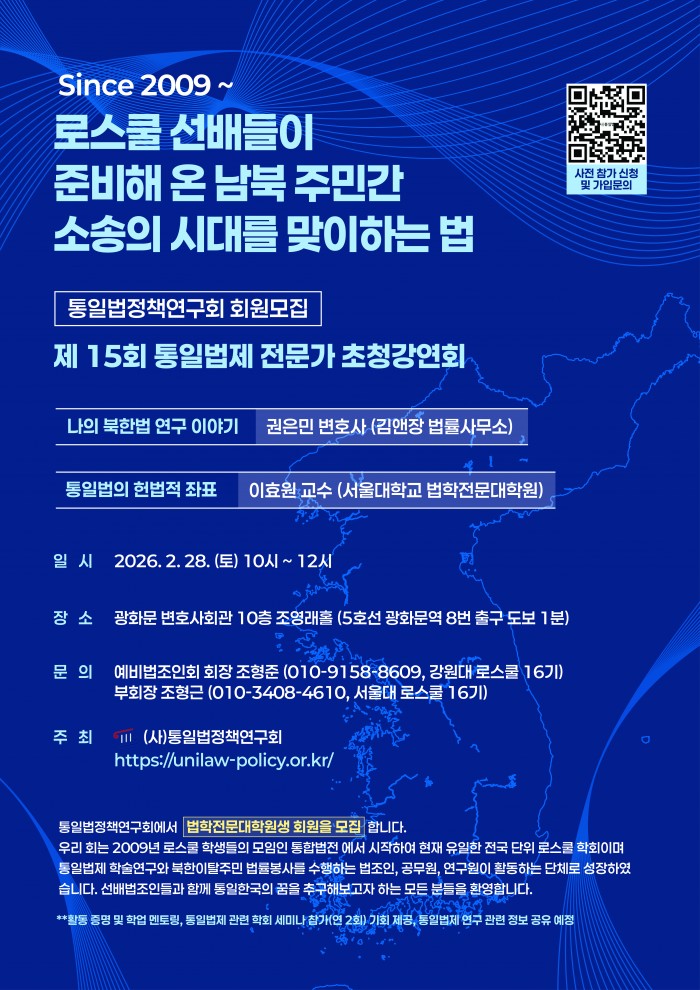 (사)통일법정책연구회 주최 제15회 전문가초청강연회 안내 페이지 정보 작성자관리자 조회 75회 작성일 2026-02-24 댓글 0 본문 첨부파일을 참고하시기 바랍니다. 이전글 [필독] 2026학년도 법학전문대학원 졸업시험 시행 계획 안내 다음글「장애 학부·법학전문대학원생 네트워킹 간담회」 개최 안내 목록 댓글목록 등록된 댓글이 없습니다.