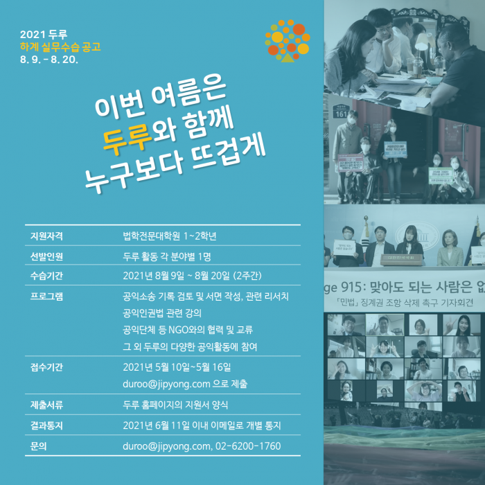 [사단법인 두루] 2021년 법학전문대학원생 하계 실무수습 안내
