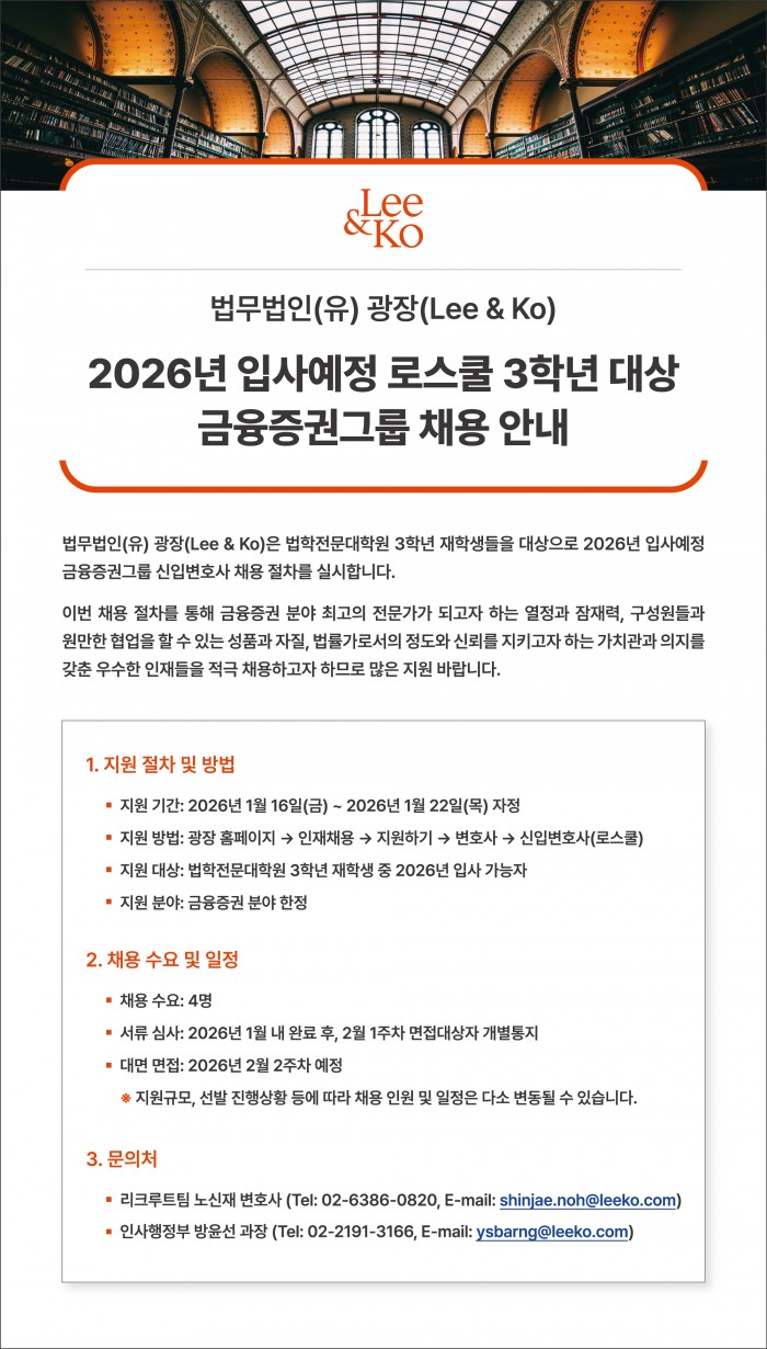 [법무법인(유) 광장] 2026년 입사예정 로스쿨 3학년 대상 금융증권그룹 채용 페이지 정보 작성자관리자 조회 131회 작성일 2026-01-14 10:53:13 댓글 0 본문 첨부파일을 참고하시기 바랍니다. 첨부파일 [법무법인유 광장] 2026년 입사예정 로스쿨 3학년 대상 금융증권그룹 채용 공고문.pdf (11.3M) 12회 다운로드 | DATE : 2026-01-14 10:53:13 다음글[법무법인대한중앙] 신입변호사 채용 목록 댓글목록 등록된 댓글이 없습니다.